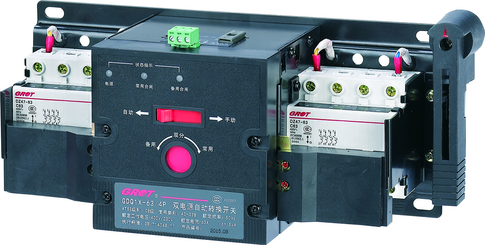 GDQ1X series dual power automatic transfer switch belongs to CB grade, suitable for AC 50Hz / 60Hz, rated working voltage 230/400V, rated current up to 63A of dual power supply system. In the case of common power failure, the switch can be applied with standby power or power generation automatic switching of the machine to ensure the reliability and safety of the power supply. It is used to ensure that power supply places such as hospitals, shopping malls, banks, fire-fighting, high-rise buildings, etc. guarantee powered keeping on. The product has a flame-fighting interface, which can be easily linked with the flame-fighting equipment, and the switch is remotely controlled to cut off the power. The flame-fighting product has a generator interface to automatically start or stop working of the generator.